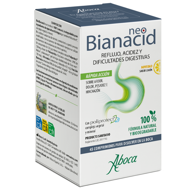 NeoBianacid es un producto a base de complejos moleculares vegetales y minerales, que ejerce una acción protectora y, por tanto, lenitiva de la mucosa gastroesofágica útil para contrarrestar rápidamente el ardor, el dolor y la sensación de acidez, es decir, los síntomas típicos de la irritación y la inflamación de esta misma mucosa.